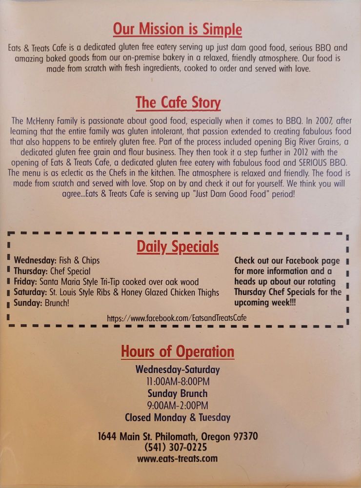 Welcome to Eats & Treats Cafe, a haven for gluten-free and barbecue lovers in Philomath, Oregon. This cafe offers a diverse menu with options for everyone, including vegan and vegetarian dishes. The atmosphere is casual and welcoming, perfect for any occasion from brunch to dinner. Customers rave about the delicious food, attentive service, and the extensive gluten-free offerings. Standout dishes include the Breakfast Side of Brunch with hearty options like the Hungry Plate, Omelettes like the Mushroom and Swiss, and mouthwatering Waffles including the Waffle Cristo. With a focus on quality ingredients and excellent service, Eats & Treats Cafe is a must-visit for anyone looking for a satisfying and gluten-free dining experience.
